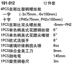 此组套所配置工具,具有螺钉与螺母的装配,夹持工件、剪切线材、电路探测、敲击、切割和测量、等功能,适用于家庭,物业管理,工厂车间等简易装备与维修。